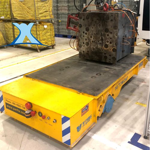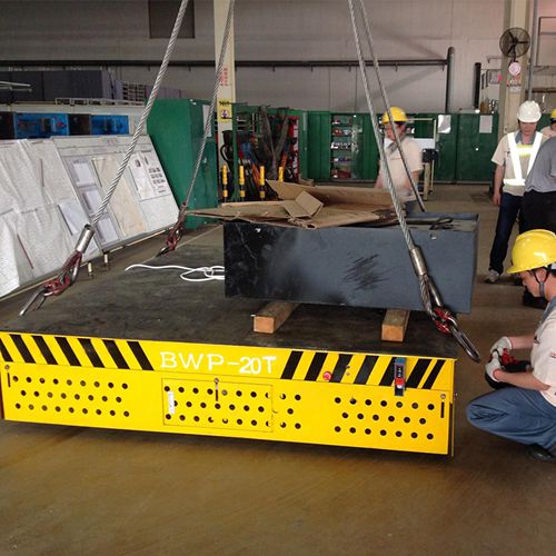 客戶需要在1號車間和2號車間廠房進行往返運行,在1號車間用重型吊車吊起模具然后放置在無軌模具車上,然后通過無軌模具車在運輸到2號車間,進行下面的流程,運輸距離大致在50米左右,我們為客戶量身定制模具轉運車是我公司一款BWP20t 產品,該模具平板車具有操作靈活,360度無死角防護、遇人自動停止等功能,既保證了車間人員的安全,又輕盈便捷將繁重的模具搬運至目的地.